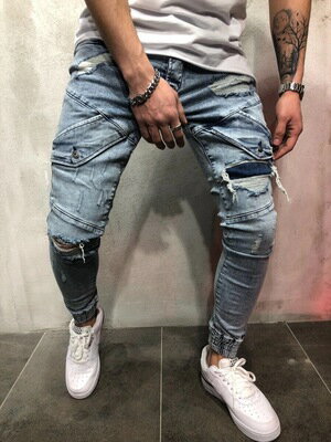 デニムパンツ男子 メンズジーンズ ズボン バイクパンツ ボトムス 男性ロングパンツ カジュアル ストレッチ スキニー ダメージ オートバイ 個性ブルー